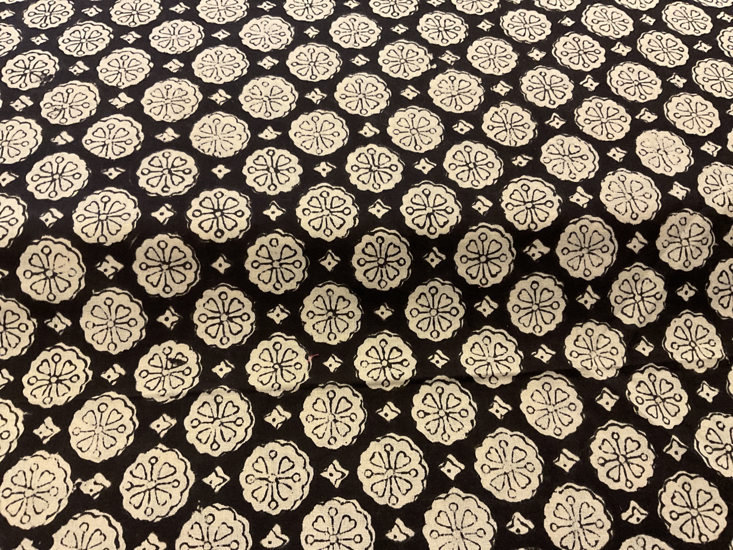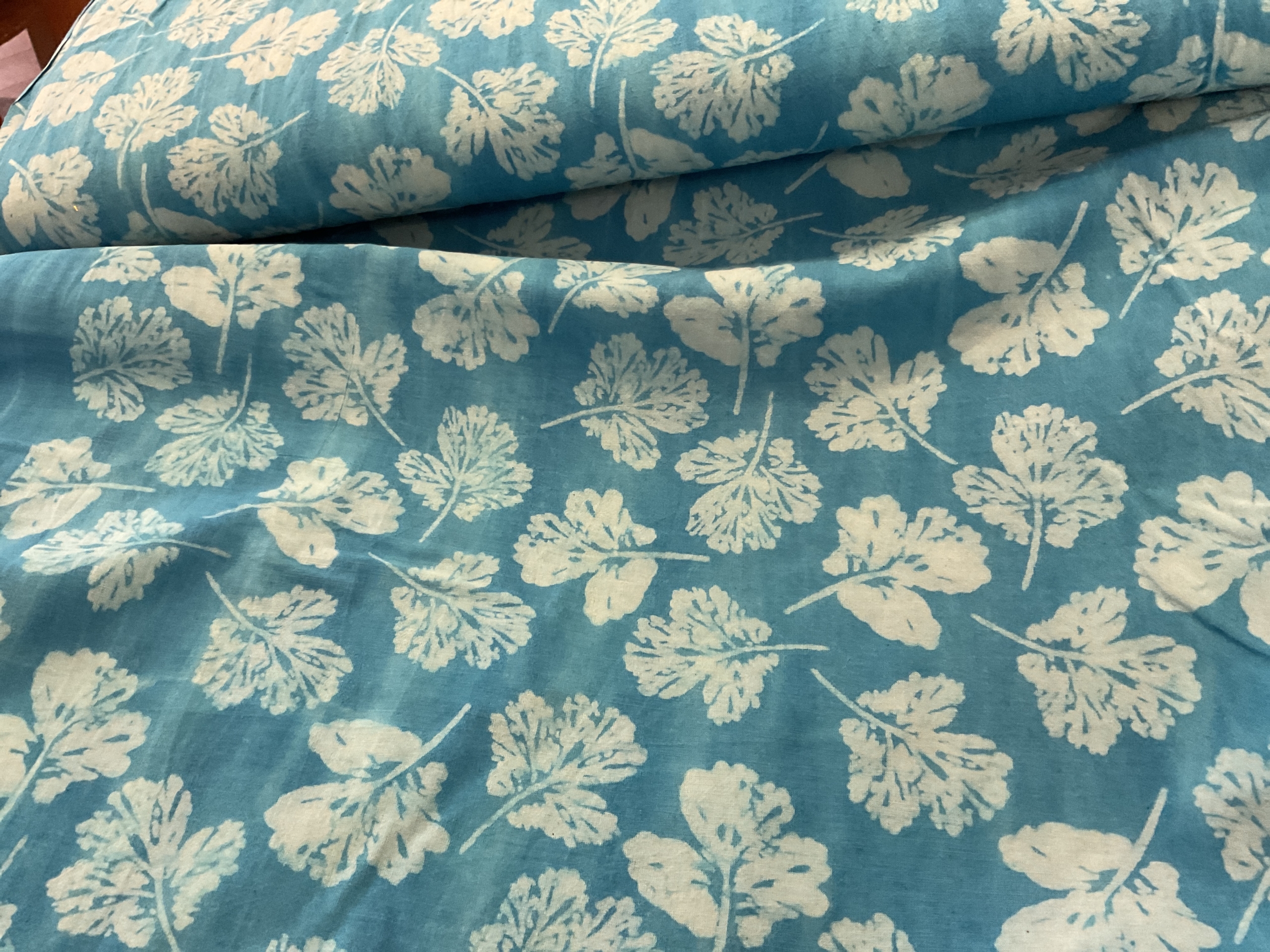 Indigo blue prints, Dabu is a mud resist hand block print using indigo dye. Indigo is a fixed dye as it bonds with the fibers of the fabric upon hitting the air in an oxidation process. However indigo dyes often have some excess dye in the fabric. It is recommended that you wash the fabric at 30 degrees seperately before sewing to wash out this excess. A spoon full of salt in the wash will help set the dye even more. Do not tumble dry as the heat may cause the print to fadeprematurely. Dry in shade as direct sunlight may fade the natural dyes.