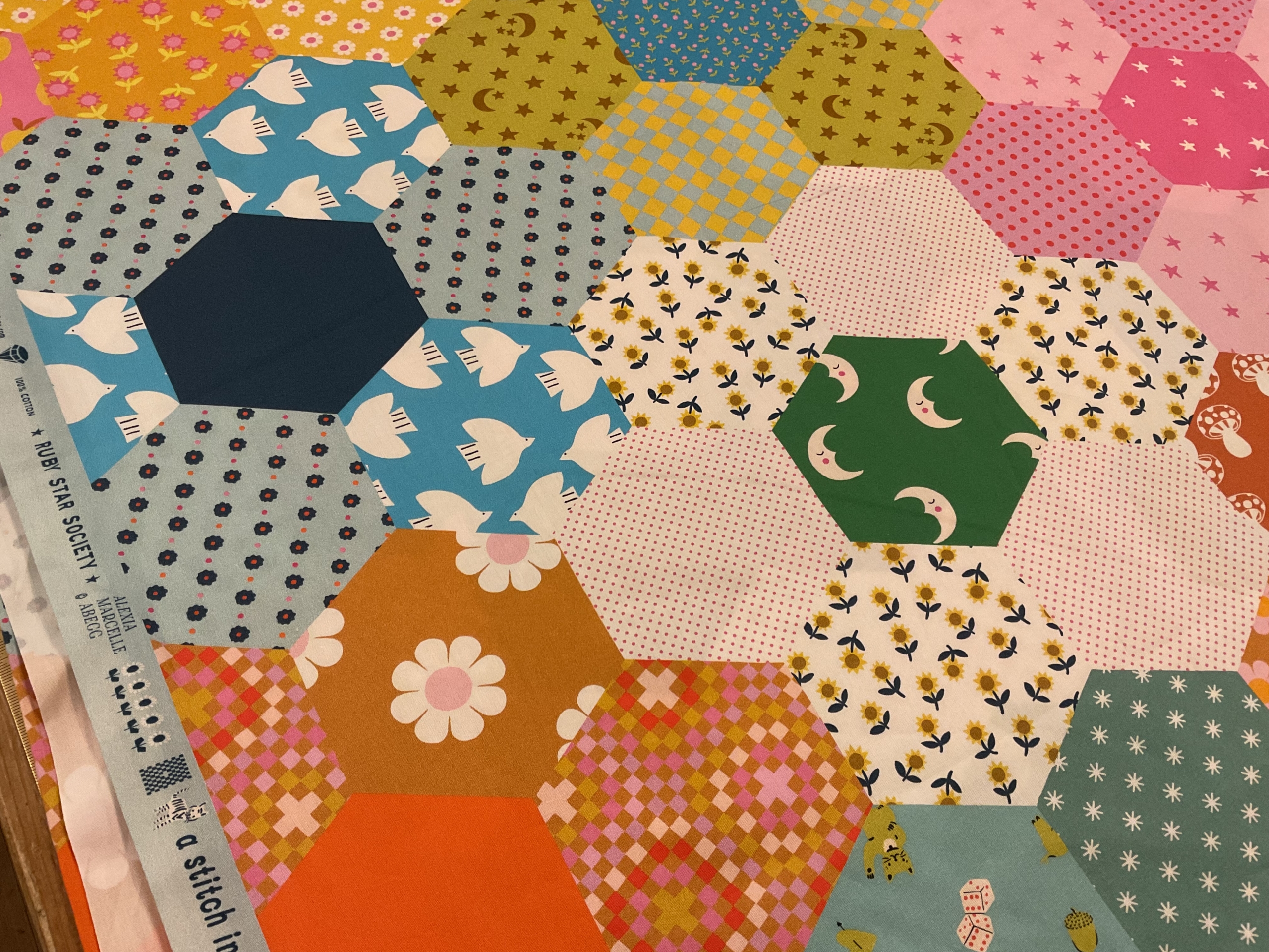 Ruby Star Society’s Catnap collection brings playful charm to your quilting projects with this 108-inch wide backing fabric. Featuring a delightful hexagon patchwork cheater print, this design eliminates the need for piecing while delivering patchwork aesthetics. The generous width reduces seaming on large quilts, making it ideal for backing bed-sized projects with minimal waste. Perfect for quilters seeking design impact without the time investment of traditional piecing. It is suitable for use with sewing machines and hand sewing,
